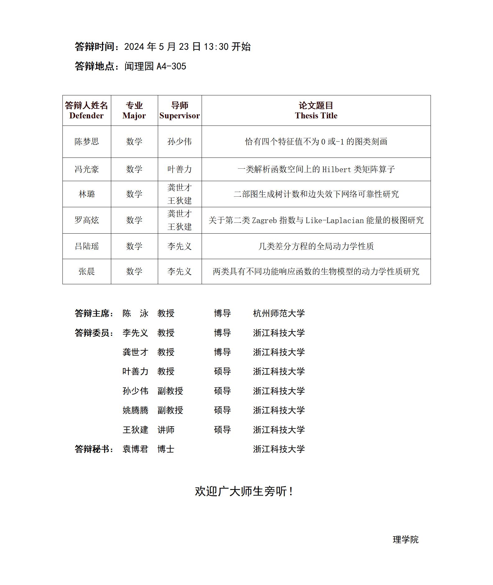 2024年浙江科技大学硕士研究生学位论文答辩公告(数学1组)