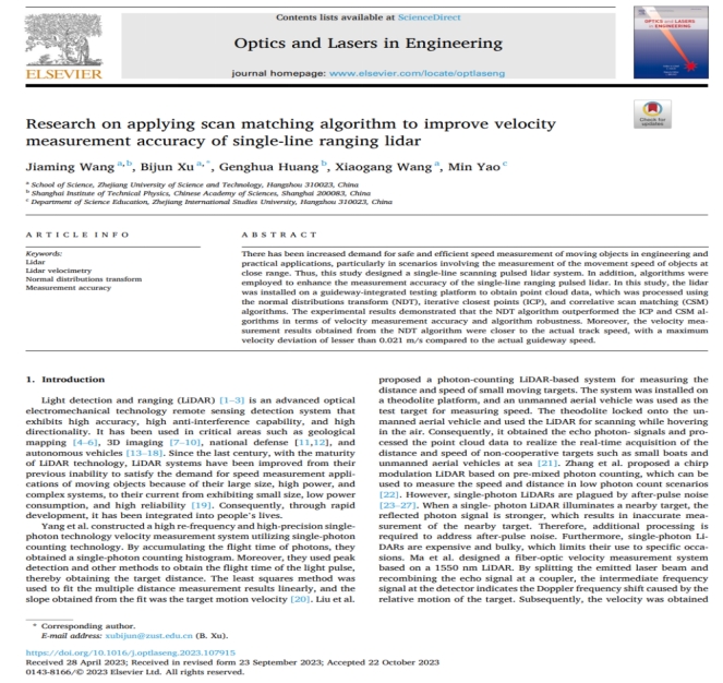光子与光场调控研究团队中2020级研究生汪家铭以第一作者身份在《Optics and Lasers in Engineering》期刊上发表了题为“Research on applying scan matching algorithm to improve velocity measurement accuracy of single-line ranging lidar”的创新研究文章。浙江科技学院为第一单位,应用物理系徐弼军教授和汪小刚教授分别为论文通讯作者和共同指导教师。《Optics and Lasers in Engineering》是ELSEVIER旗下知名期刊,影响因子4.6,中科院SCI二区。