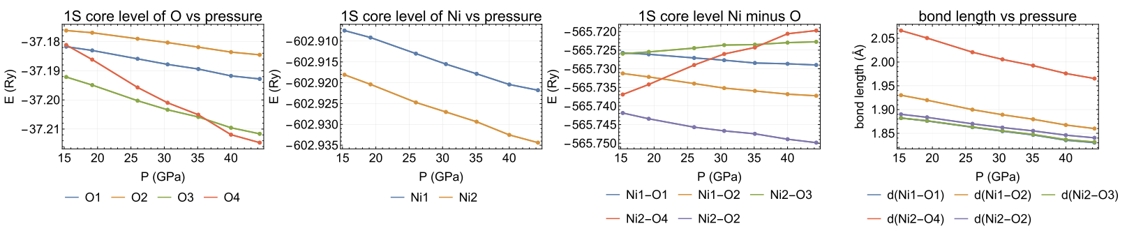 图4. (a)(b)(c) Ni, O的1S电子能级以及两者之差随压力的变化。(d) Ni-O键长随压力的变化