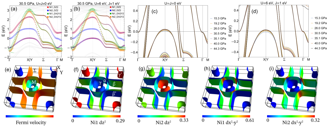 图2. La4Ni3O10能带和费米面的费米速度分布和Ni的dz2, dx2-y2轨道分量分布