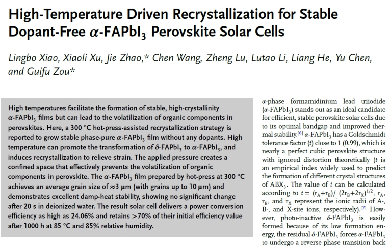 薄膜,是一种新型的温度诱导钙钛矿薄膜固相二次结晶技术,实现了高效稳定钙钛矿太阳能电池的制备。同时,该固相重结晶技术为实现钙钛矿薄膜的大面积制备和全固相制备提供了参考思路。文章链接://doi.org/10.1002/advs.202408684(应用物理系 孙婷婷 学科办 陈璟)