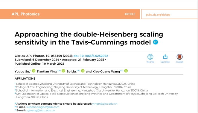 应用物理系量子信息物理研究团队在国际学术期刊《APL Photonics》(IF=5.6,中科院一区)期刊上发表了题为"Approaching the double-Heisenberg scaling sensitivity in the Tavis-Cummings model"的研究论文,该论文被选为Editor's Pick(编辑精选)。(Editor's Picks serve to highlight articles with excellent scientific quality and are representative of the work taking place in a specific field)。浙江科技大学为第一单位,应用物理系苏玉国博士为第一作者。此研究获得国家自然科学基金、浙江省自然科学基金杭州联合基金、杭州市自然科学基金的支持。