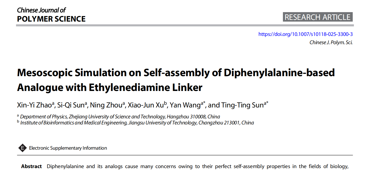 软物质与功能纳米材料研究团队在“短肽衍生物自组装领域”取得重要的研究进展,相关研究成果以浙江科技大学为第一单位在国际期刊《Chinese Journal of Polymer Science》(IF = 4.1,中科院SCI二区,JCR Q1)上,在线发表题目为“Mesoscopic Simulation on Self-assembly of Diphenylalanine-based Analogue with Ethylenediamine Linker”的论文。物理学硕士研究生赵欣怡为该论文第一作者,应用物理系王艳博士和孙婷婷教授为共同通讯作者,浙江科技大学为第一单位。该研究得到了国家自然科学基金和浙江省自然科学基金的支持。