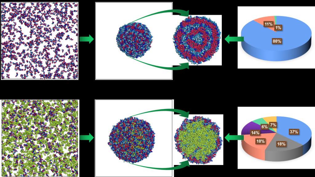 该论文通过利用耗散粒子动力学模拟方法研究苯丙氨酸二肽衍生物PA在不同浓度和溶液环境下的自组装过程。模拟结果显示,衍生物PA分子在水和50%酒精溶液中会自组装形成有趣的洋葱状纳米球结构,且洋葱圈层的数量与分子浓度有关。这项模拟研究可以捕捉苯丙氨酸二肽衍生物PA在溶液环境中的动态演化过程并通过数据分析揭示其自组装机制,这为后续设计和开发新型纳米载药体系提供一定的理论指导。(应用物理系 孙婷婷 学科办 陈璟)