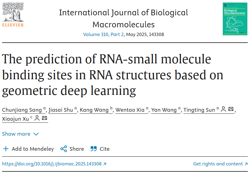 应用物理系软物质与功能纳米材料研究团队在国际学术期刊《International Journal of Biological Macromolecules》 (IF=7.7,中科院二区TOP) 期刊上发表了题为"The prediction of RNA-small molecule binding sites in RNA structures based on geometric deep learning"的研究论文。浙江科技大学为第一单位,应用物理系2022级硕士研究生桑春江为第一作者,浙江科技大学孙婷婷教授、江苏理工学院许晓军教授为论文通讯作者。