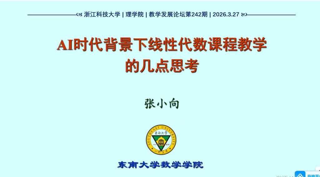 2026年3月27日下午,东南大学数学学院张小向教授应邀作了题为《AI时代背景下线性代数课程教学的几点思考》的教学论坛专题报告。报告由加拿大28